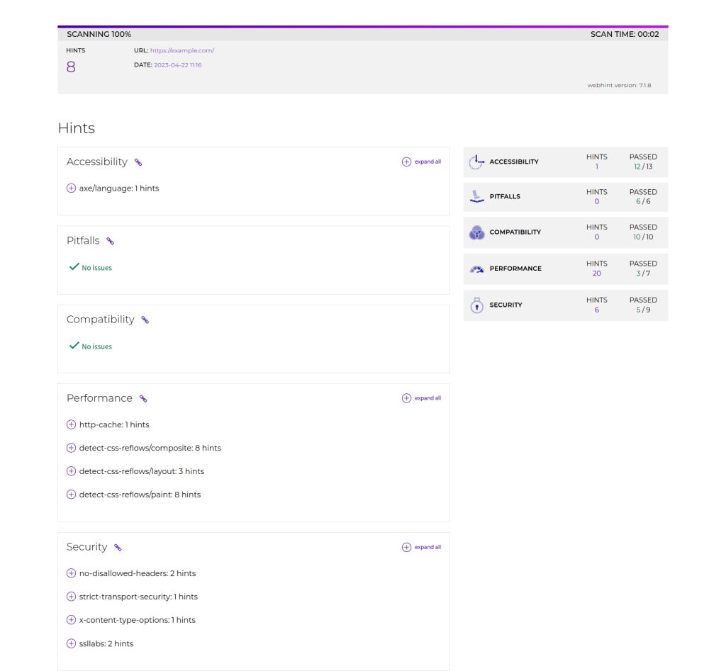 Webhint is a customizable linting tool that helps you improve your site’s accessibility, speed, cross-browser compatibility, and more by checking your website http header and html code for best practices and common errors.